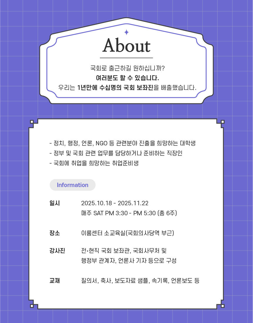- 국회보좌진 실무교육을 통해 미래 보좌진을 지망하는 청년들의 이해를 높여 전문 예비 인력양성을 목적으로 함